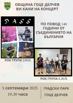 Община Гоце Делчев организира рок концерт по повод 140 години от Съединението на Княжество България с Източна Румелия. В концерта ще участват рок групите DASS и С.Н.П.
