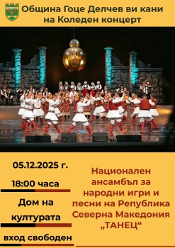 Община Гоце Делчев Ви кани на Коледен концерт на Националния ансамбъл за народни игри и песни на Република Северна Македония „Танец“ в гр. Гоце Делчев.